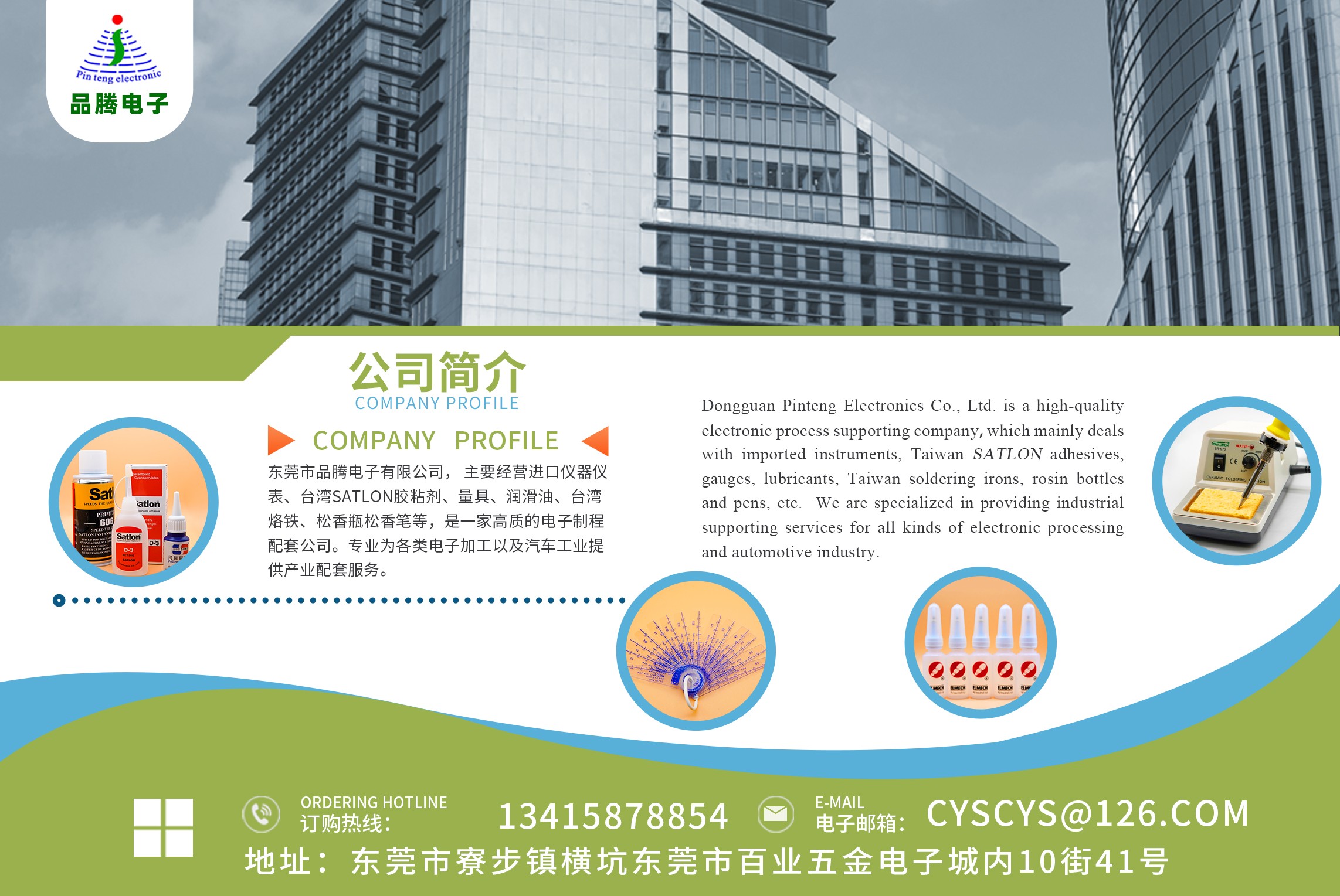 東莞市品騰電子有限公司, 主要經(jīng)營(yíng)進(jìn)口儀器儀表、臺(tái)灣Satlon膠粘劑、量具、潤(rùn)滑油、臺(tái)灣烙鐵、松香瓶松香筆等,是一家高質(zhì)的電子制程配套公司。專(zhuān)業(yè)為各類(lèi)電子加工業(yè)以及汽車(chē)工業(yè)提供產(chǎn)業(yè)配套服務(wù)。